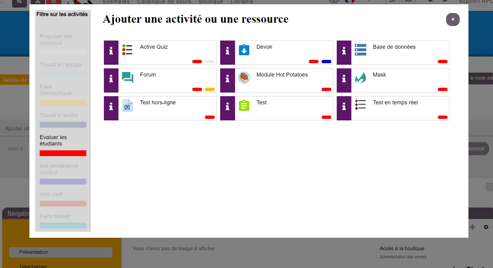 Un nouveau sélecteur d'activités voit le jour chez APL qui dépasse les évolutions du sélecteur de Moodle 3.9 ! Pour vos chargés de cours, le sélecteur évolué devient filtrable par catégories renseignées sur mesure et s'adapte aux outils que vous mobilisez uniquement Et pour couronner ce travail, votre responsable Moodle peut modifier directement l'aide apportée sur chacun des outils proposés.